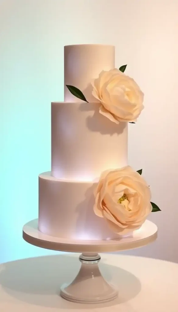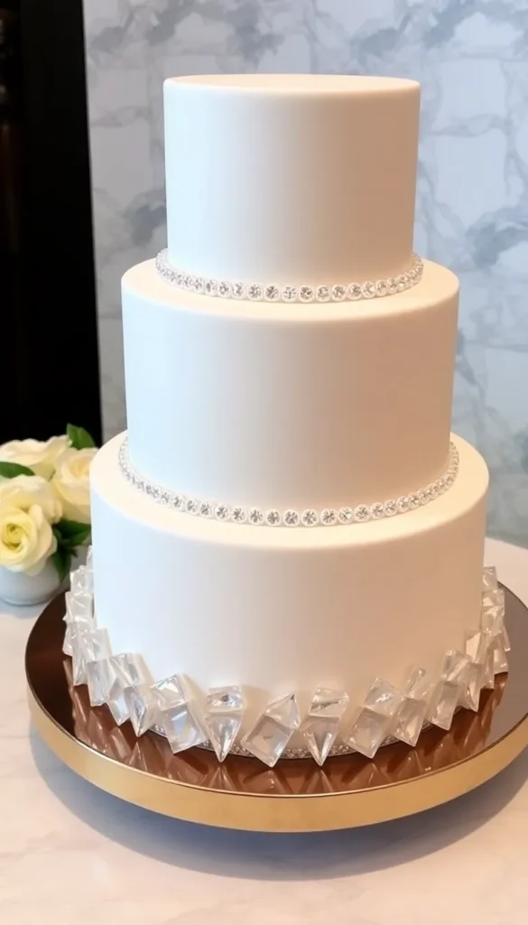 This timeless design uses pearly white frosting with subtle opal highlights. Pure elegance, perfect for traditional, luxury, or minimalist weddings.