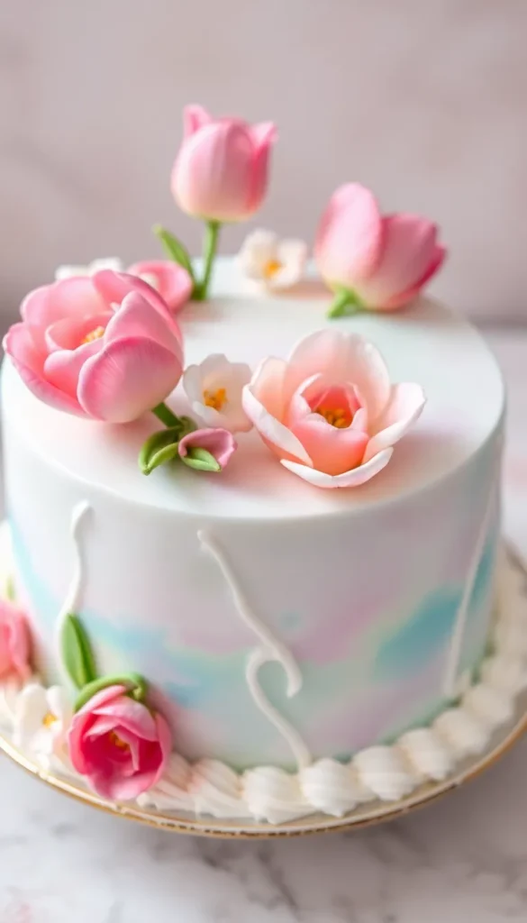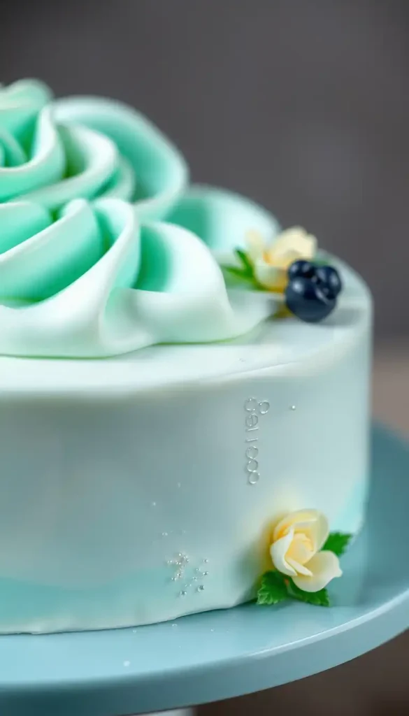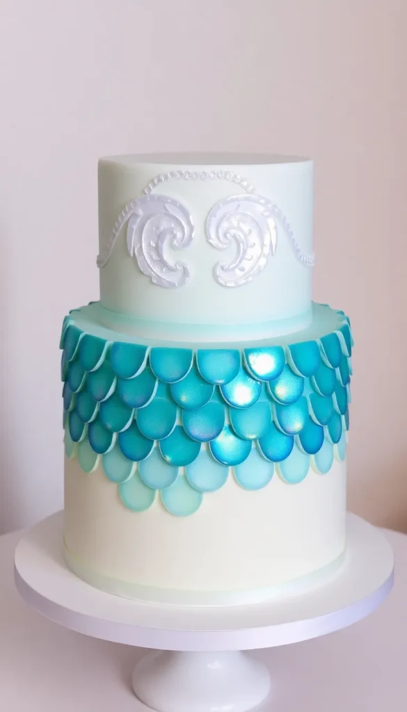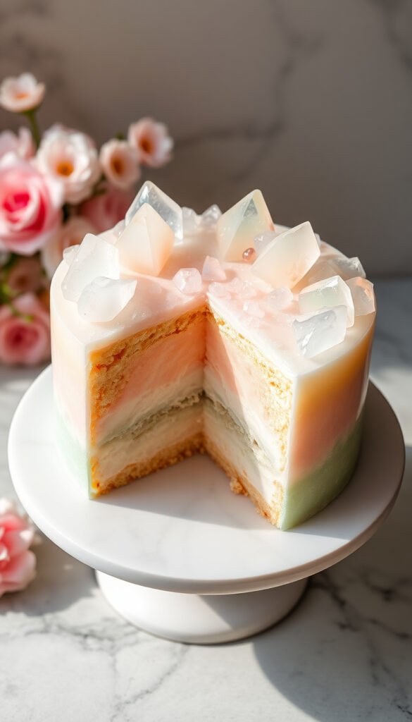 Inspired by the rare green reflections seen in opalite, this cake uses pastel mint, seafoam, and pearl tones for a fresh, glowing look.
