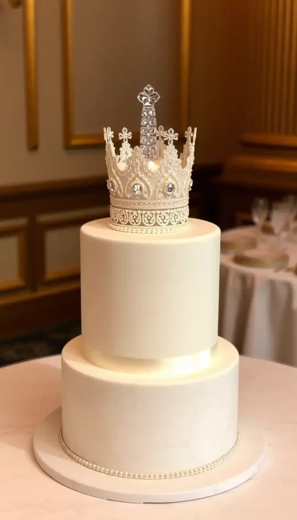 A sugar-crystal crown sits atop the wedding cake—dramatic and elegant.