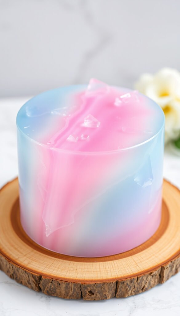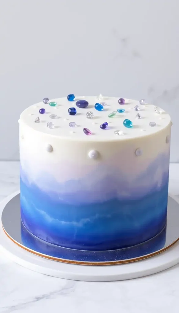 A realistic gemstone look is created with hand-marbled fondant mixing soft blues, purples, and pearl white. Ideal for gem lovers.