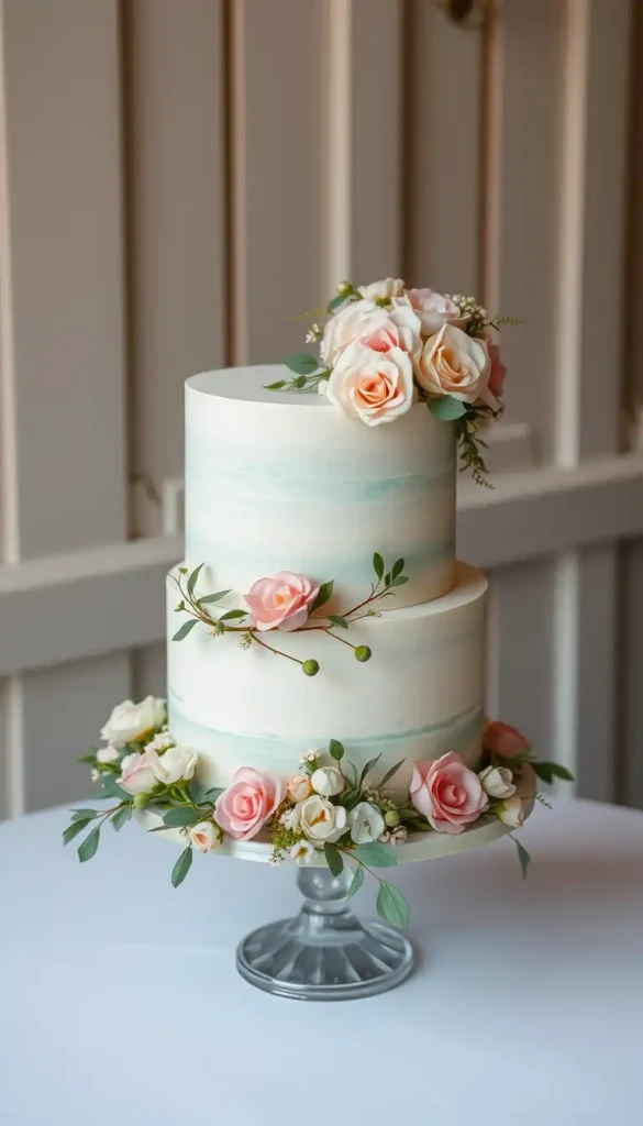A wreath of flowers encircles the middle tier of an opal-colored cake.