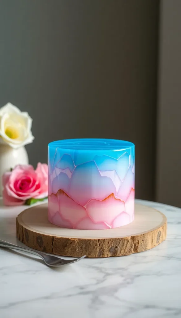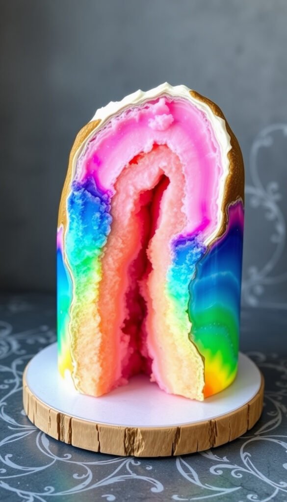 This cake shifts colors at different angles using edible iridescent dust. It mirrors the magical rainbow flashes found in opalite gemstones.