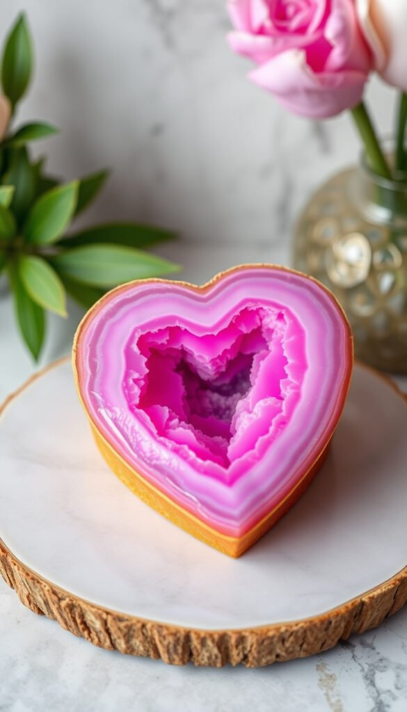 A romantic twist: a geode shaped like a heart filled with glowing sugar crystals.