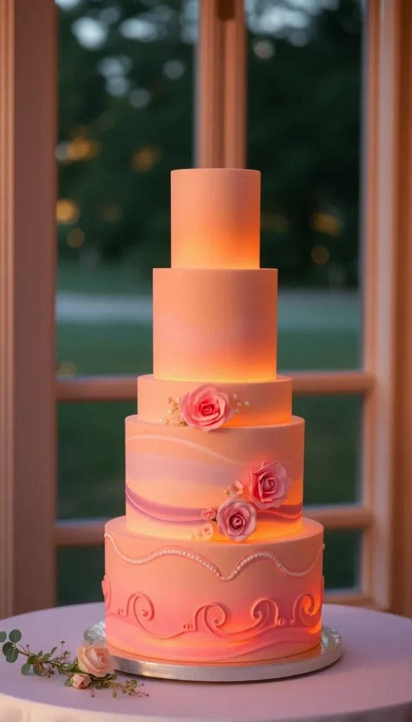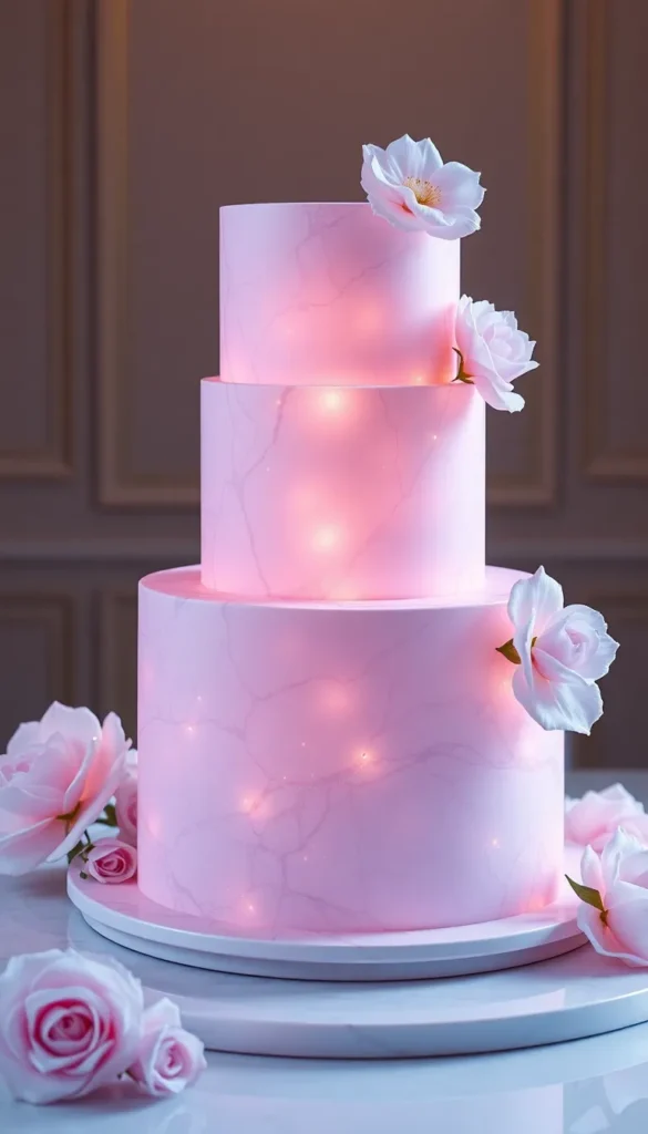 Soft pink tones layered with opal-like highlights create a delicate, feminine cake that glows under lights. Stunning for romantic or fairytale-themed weddings.