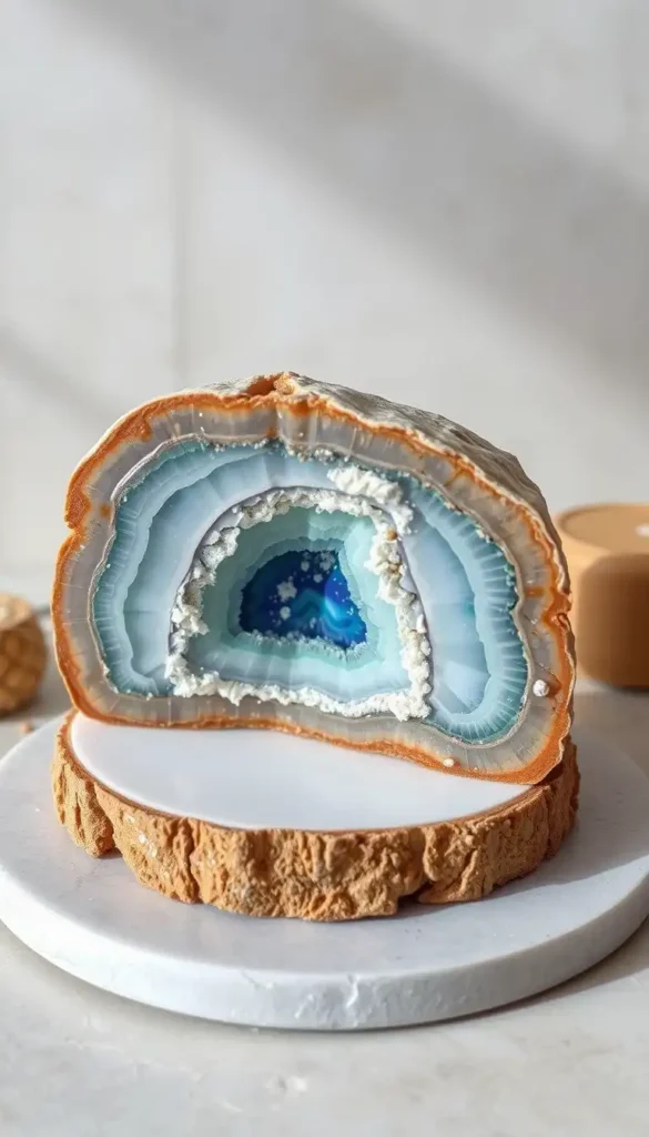 A carved geode opening with shimmering blue sugar crystals captures the glowing heart of opalite.