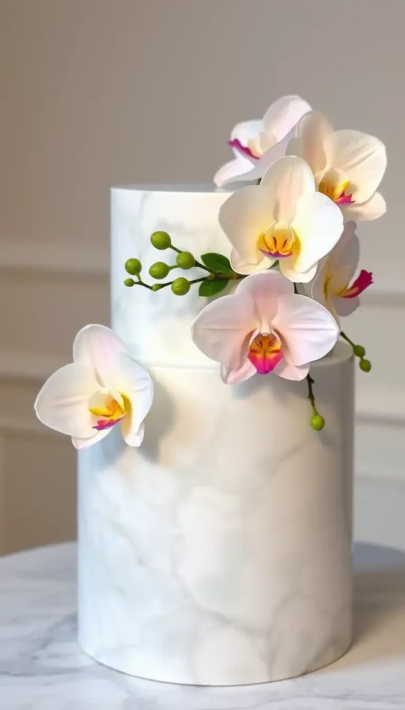 Delicate orchids in pastel shades sit beautifully on opal-marble tiers.