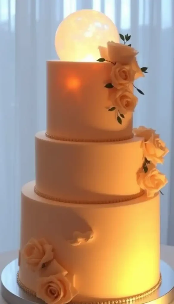 This cake features soft lavender tones blended with pearl shimmer to create a glowing opalite finish. The pastel purple adds romance, while the iridescent glow captures opalite’s natural light reflection. Perfect for elegant and modern weddings.