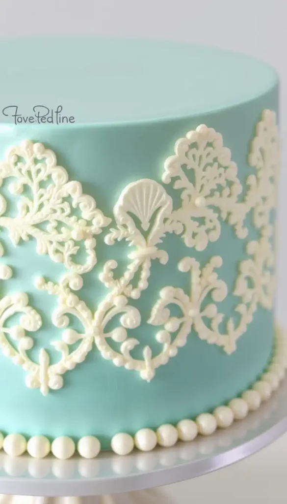 Intricate lace piping dusted with pearl shimmer screams sophistication.