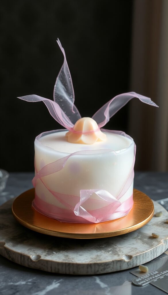Sheer edible ribbons wrap elegantly around the pastel opalite tiers.