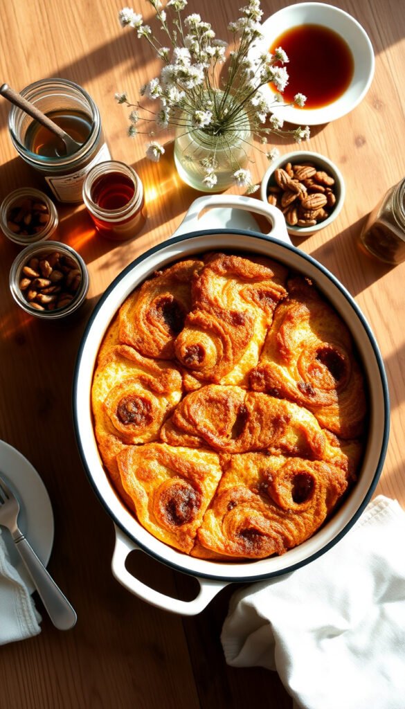 Mix brown sugar, melted butter, corn syrup, and cinnamon.Drizzle evenly over the casserole.4️⃣ Chill Overnight