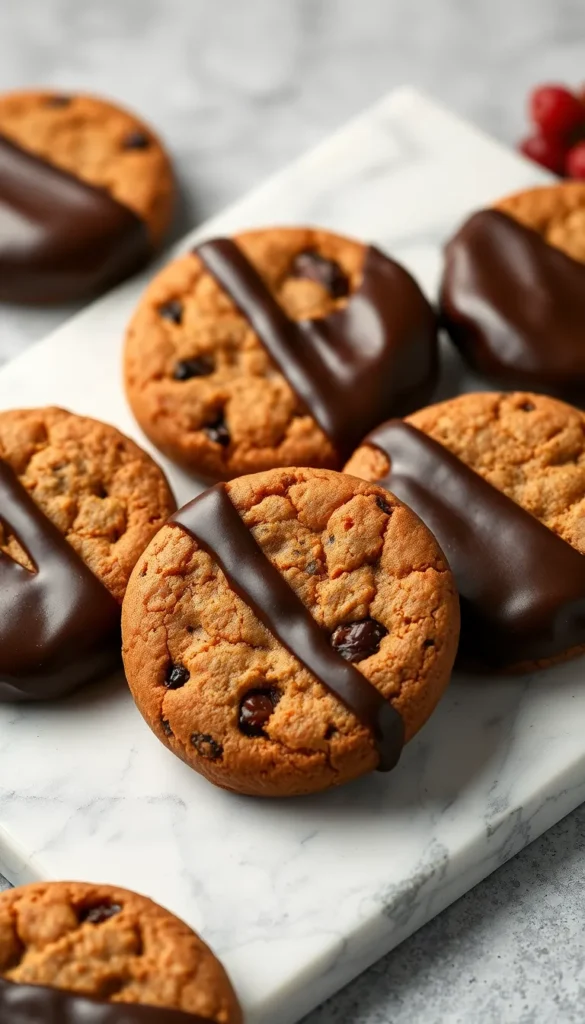 Dip cooled cookies halfway into chocolate. Chill until set.