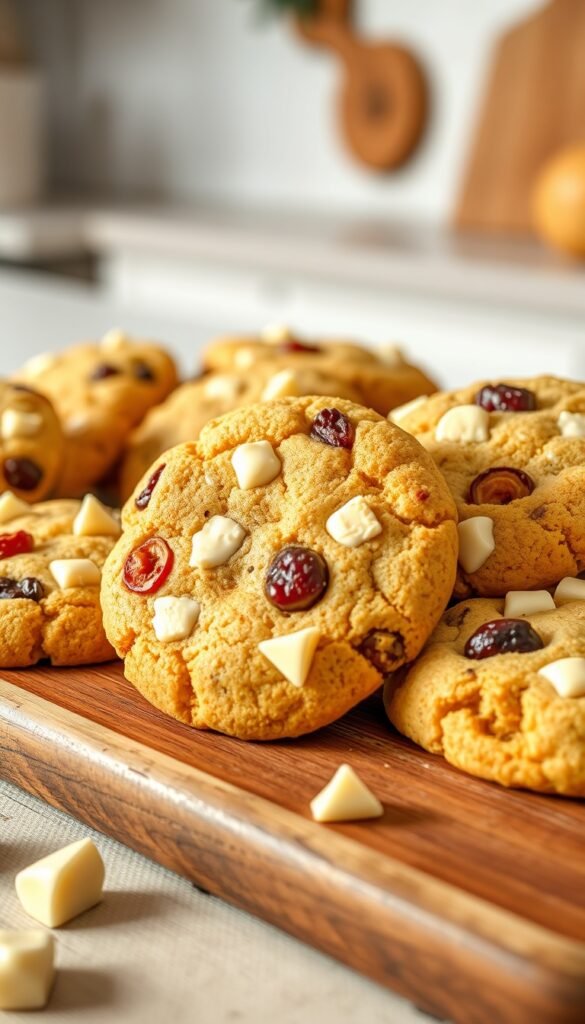 Fold white chocolate into the dough. Bake 12–14 minutes.