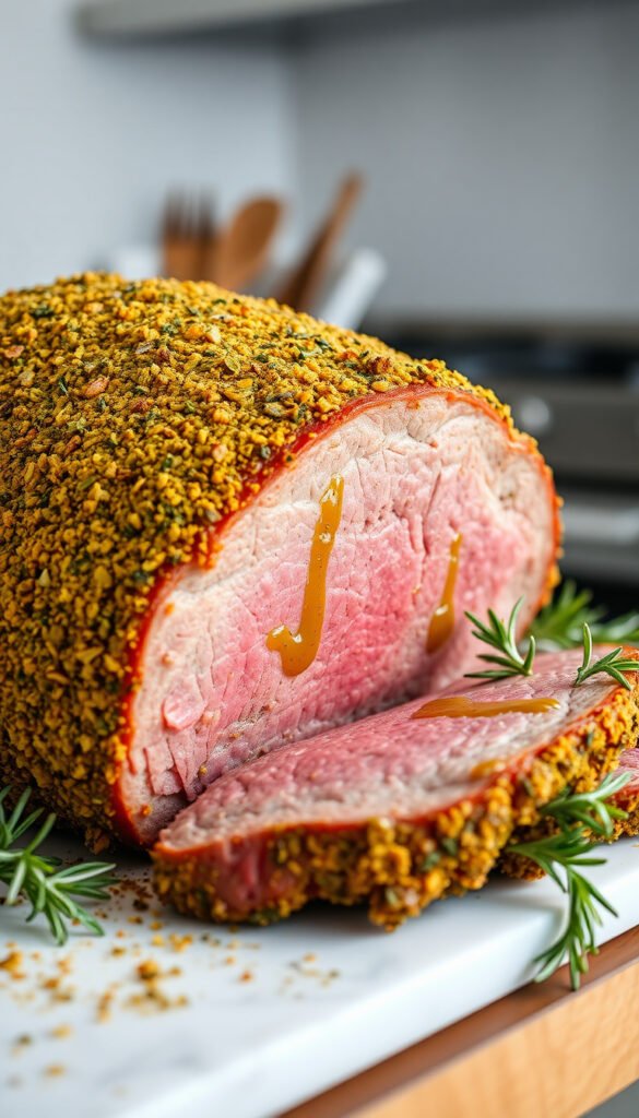 Coat roast with mustard, press herbs on all sides, then roast until tender and aromatic.