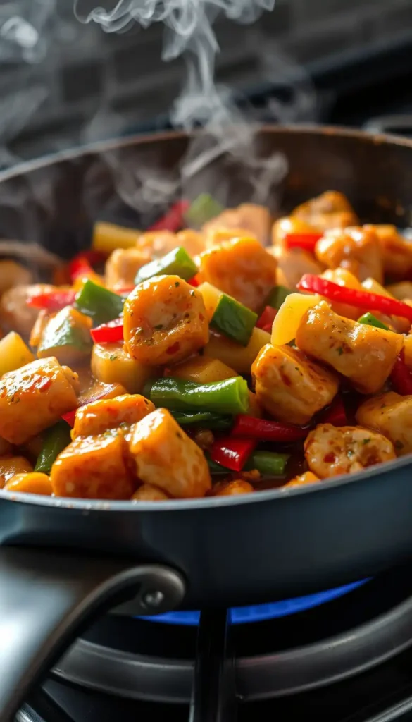 Stir-fry chicken, add veggies and sauce, cook 5 minutes.