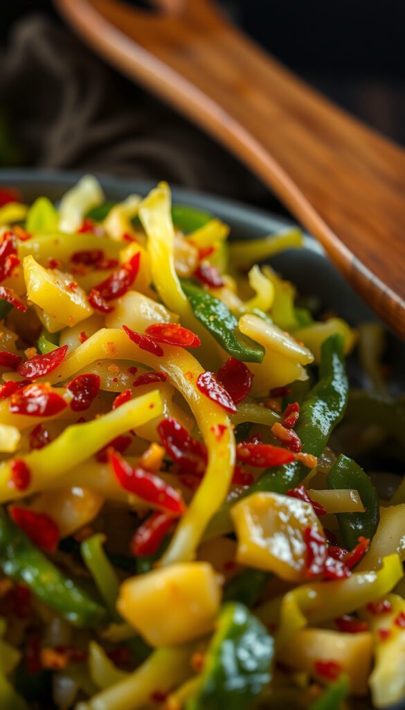 Heat oil, sauté garlic, then add cabbage and chili flakes. Cook until tender and spicy.