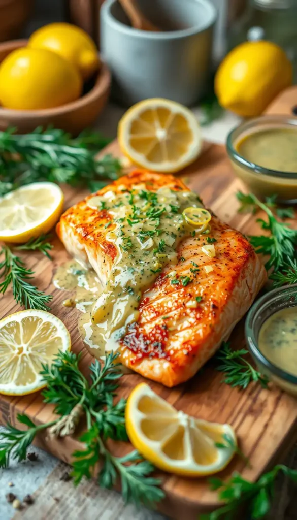 A tangy sauce combining Dijon mustard, honey, and herbs complements salmon’s natural richness wonderfully.