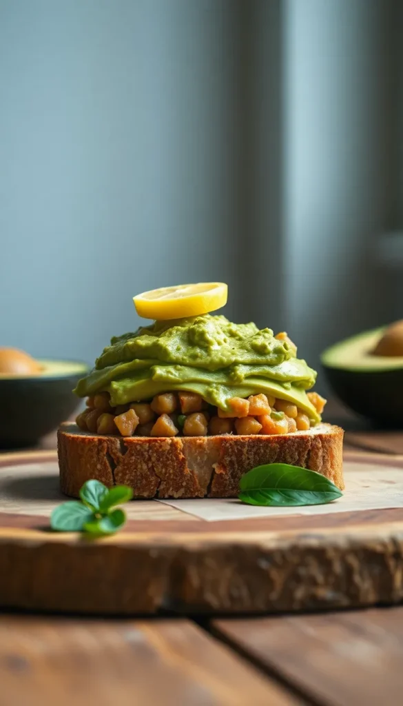 Mash chickpeas and avocado together, add lemon juice and salt, then spread generously over toasted bread. This is one of the most popular simple vegan lunches with 5 ingredients for a reason—it’s creamy, filling, and incredibly fast.