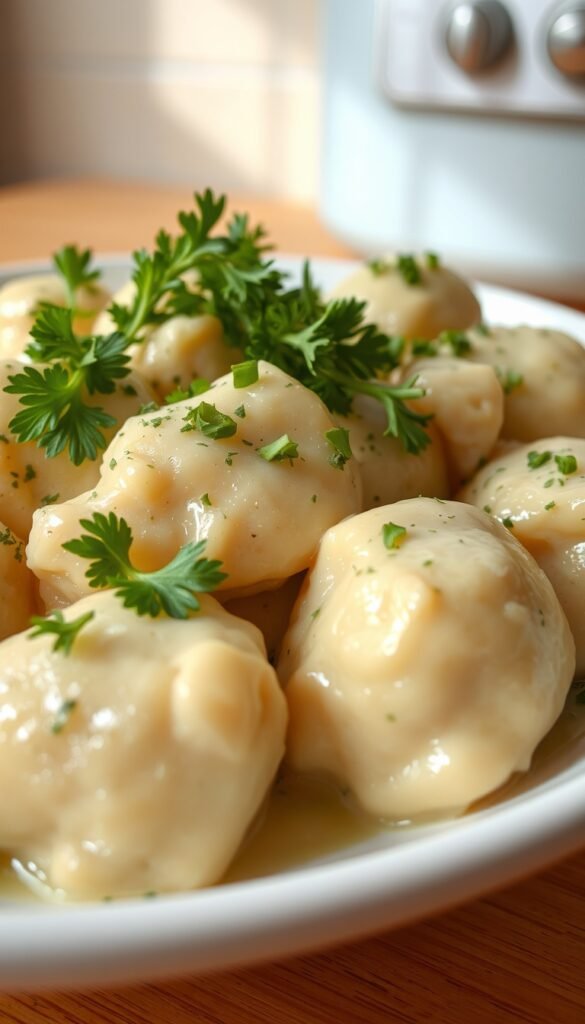 1. Classic Creamy Slow Cooker Chicken and Dumplings