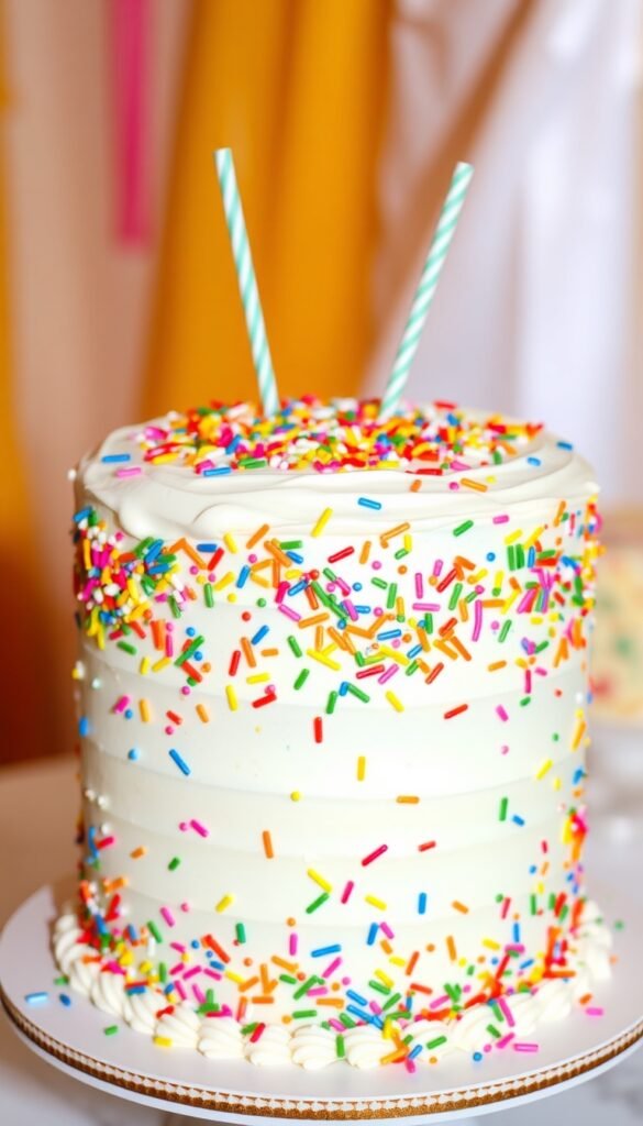 Colorful sprinkles inside vanilla cake.