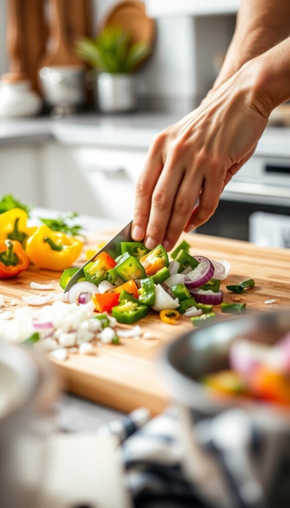 Add chopped onion and bell peppers to the skillet. Cook for 4–5 minutes until softened. Stir in garlic and cook for another minute.