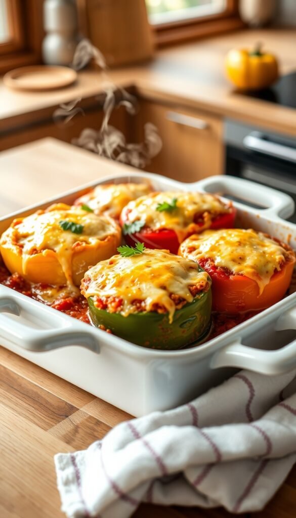 This stuffed pepper casserole combines classic comfort food flavors with modern convenience. Baking everything together allows the rice to absorb the savory tomato broth while the peppers soften perfectly. The melted cheese adds richness, making each bite comforting and satisfying.
