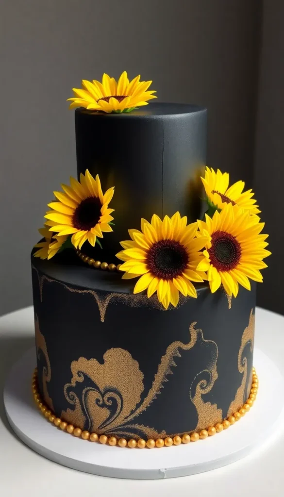 A dramatic combination—black fondant with gold effects and bright sunflowers for contrast.