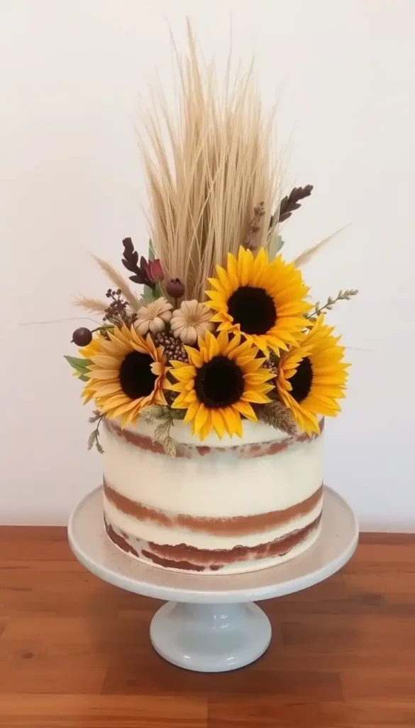 21. Boho Naked Cake with Pampas Grass and Sunflowers