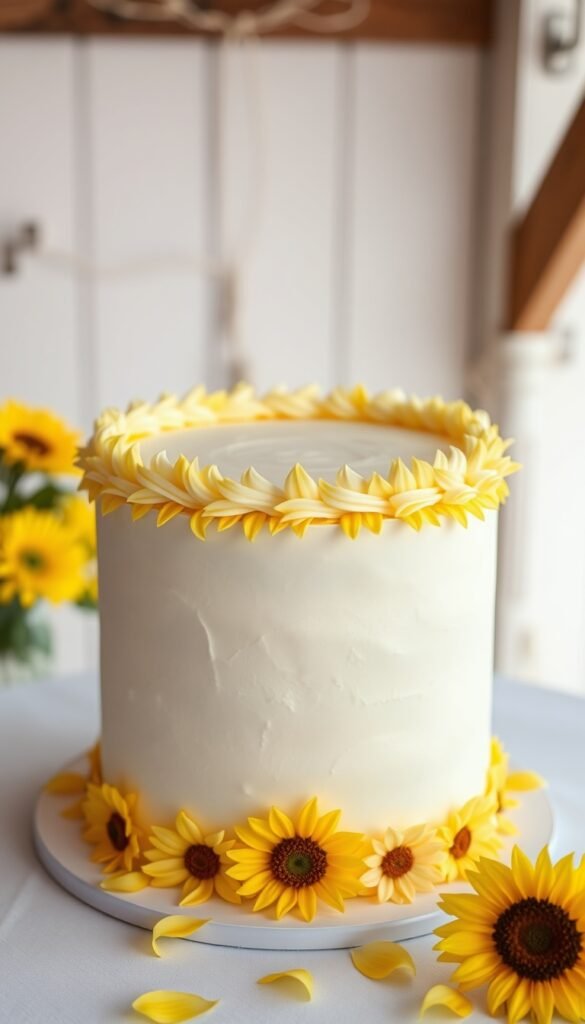 Buttercream piping creates sunflower-shaped borders around the cake—whimsical and charming.