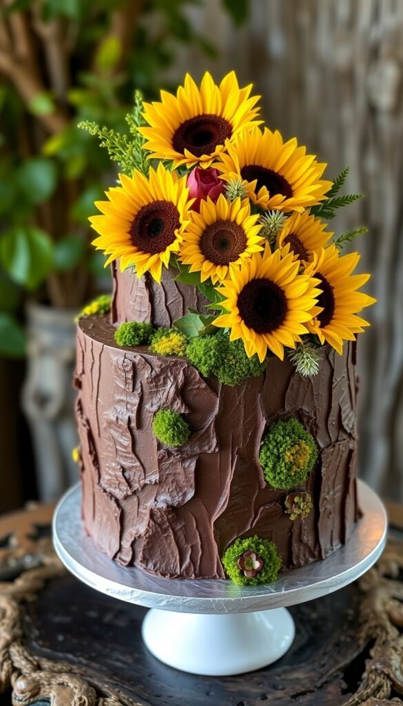 A woodland-inspired cake with textured chocolate panels that mimic tree bark. Sunflowers brighten the earthy design.