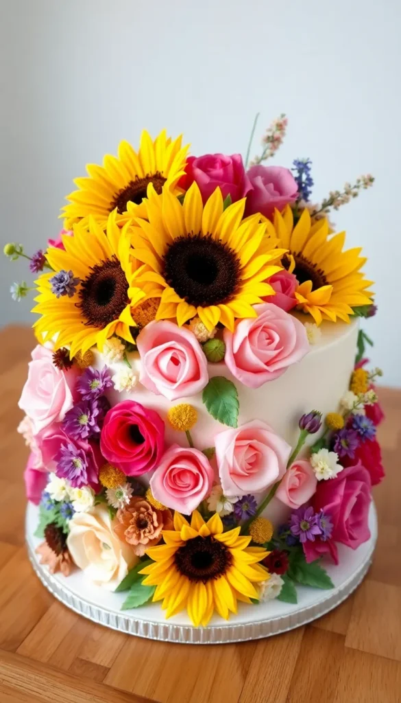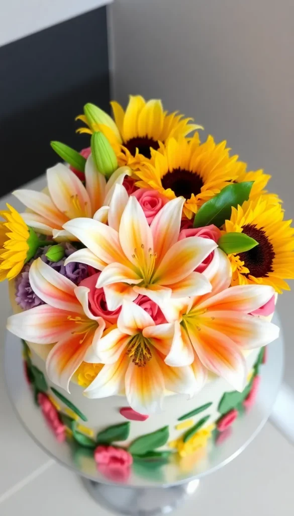 57. Multi-Flower Cake with Sunflowers, Lilies & Roses