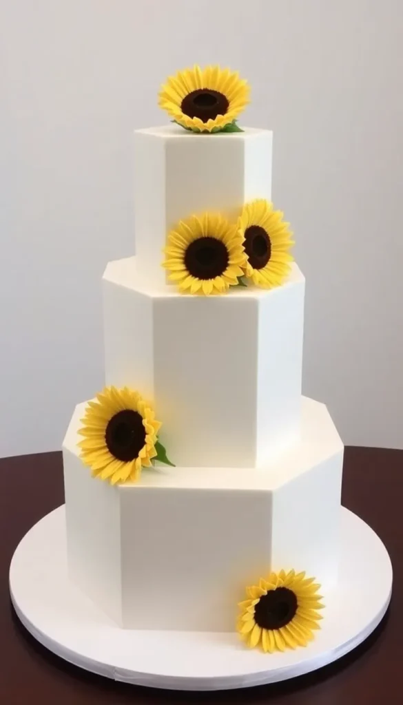 17. Geometric Hexagon Tier Cake with Sunflower Petals