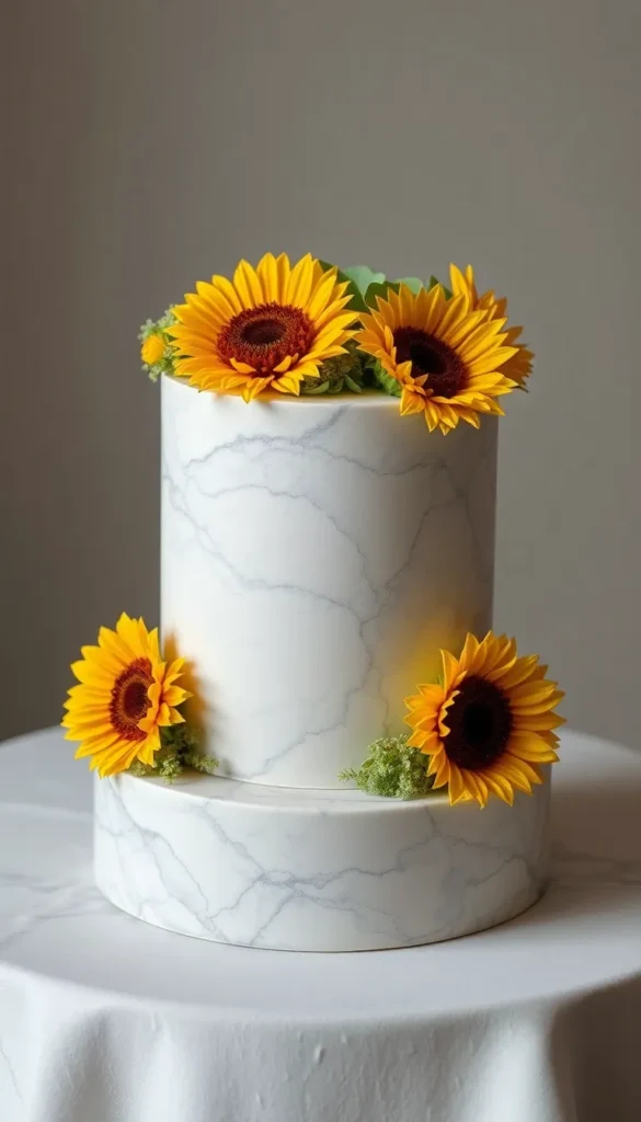 Cool-toned marble fondant paired with warm yellow sunflowers creates modern elegance.