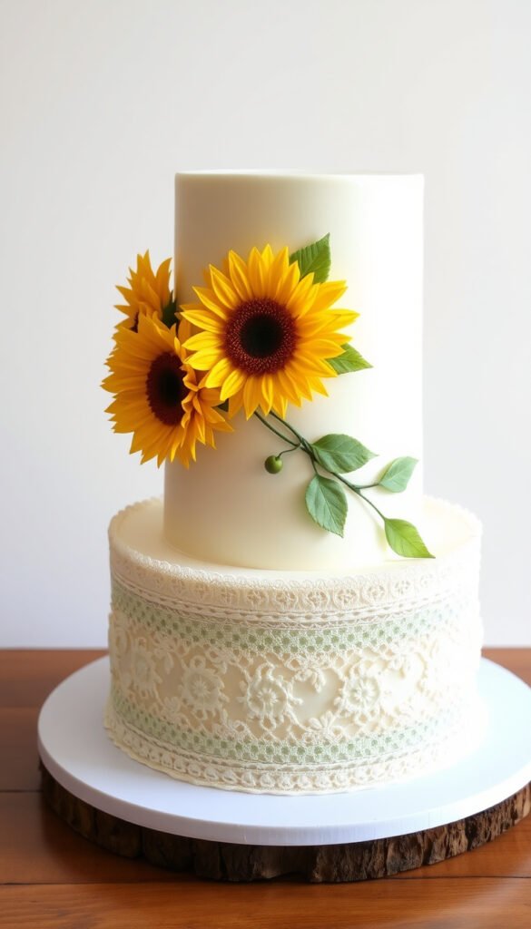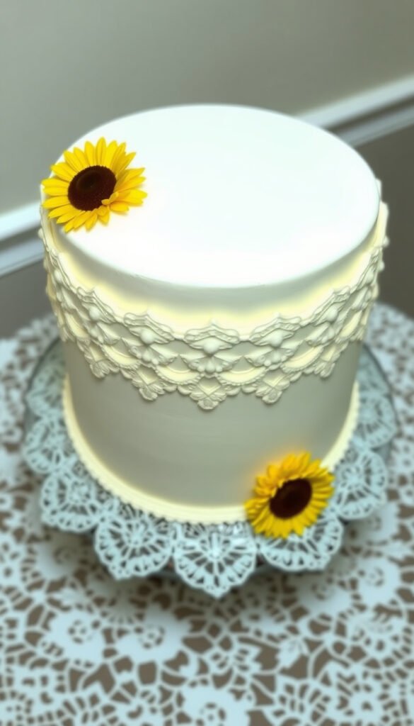 Rustic yet elegant—lace piping adds romance while sunflowers bring warmth and color.