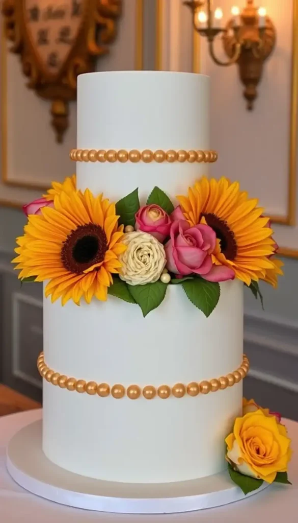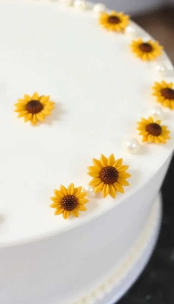 Sugar pearls and tiny sunflowers add glamorous detail without overwhelming the design.