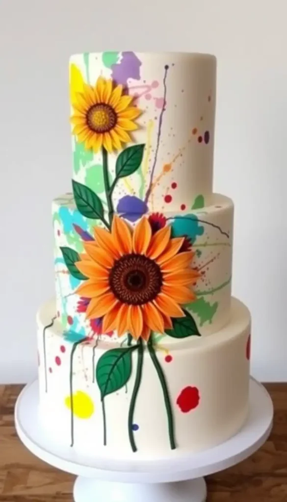 A fun, artistic cake combining bold paint splatter and sunflower illustrations.