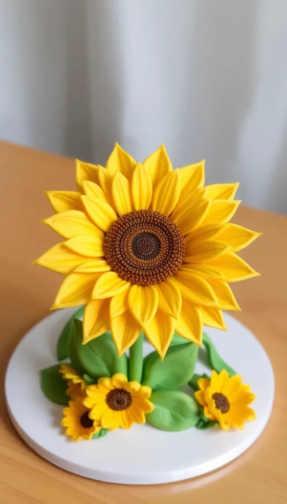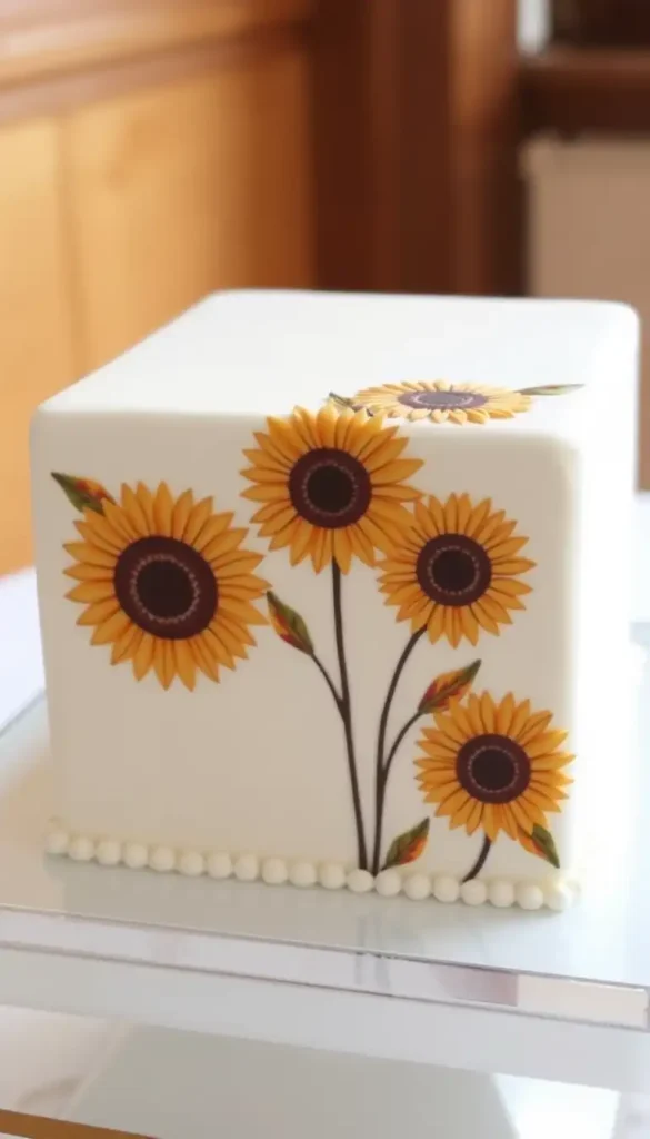 Clean, smooth fondant becomes a perfect canvas for hyper-realistic sunflower sugar art.