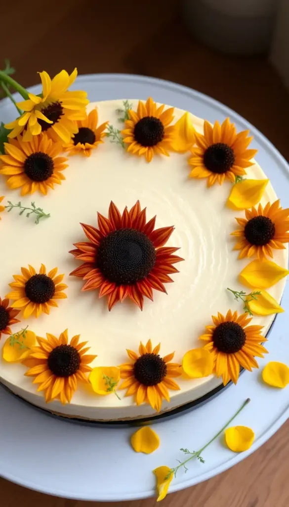 A creamy cheesecake decorated with handmade edible sunflower petals.