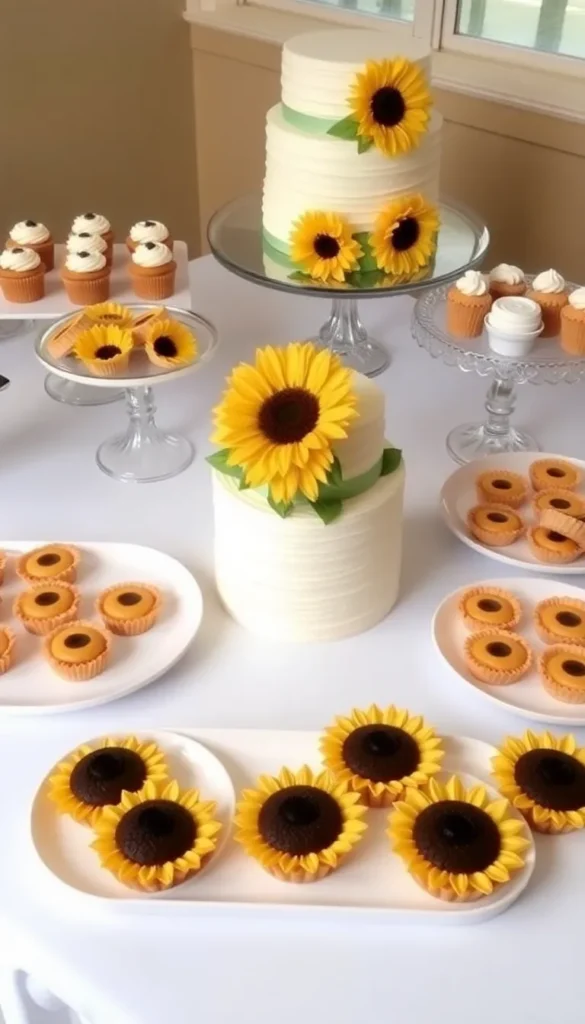 65. Sunflower Dessert Table with Mini Cake Centerpiece