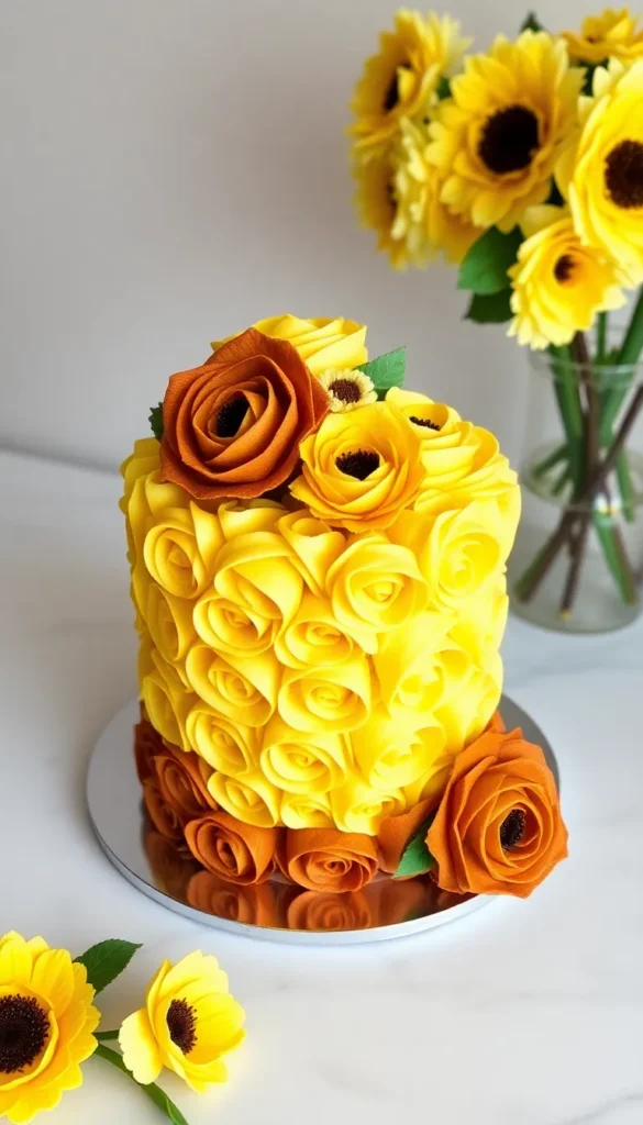 Buttercream rosettes in shades of yellow mimic blooming sunflower petals.