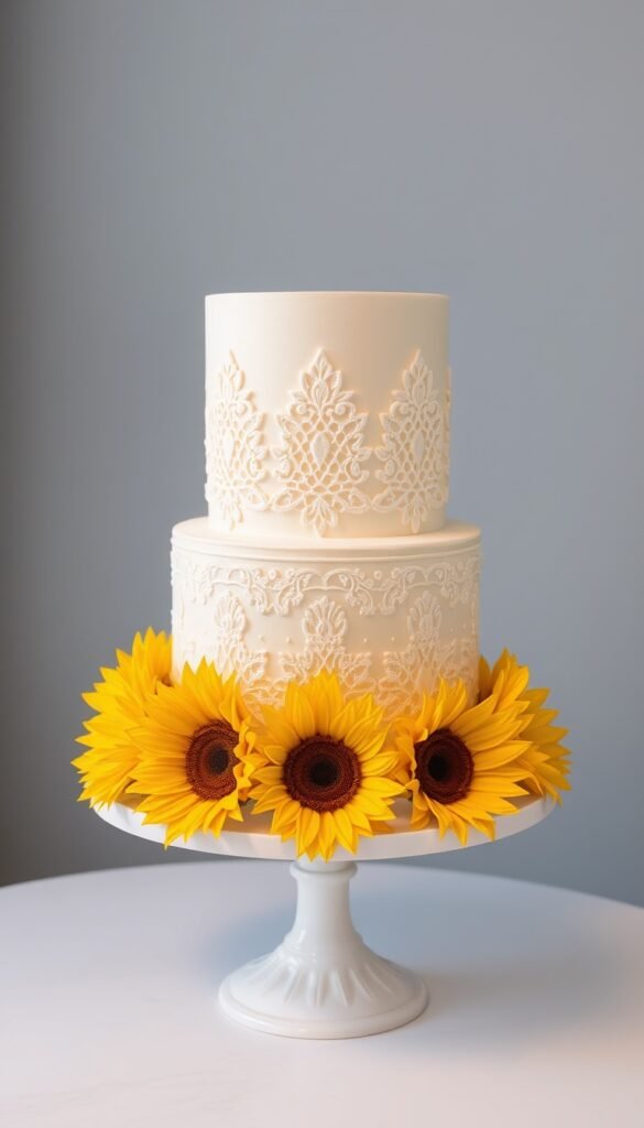 10. Lace-Patterned Buttercream Cake with Sunflower Accents