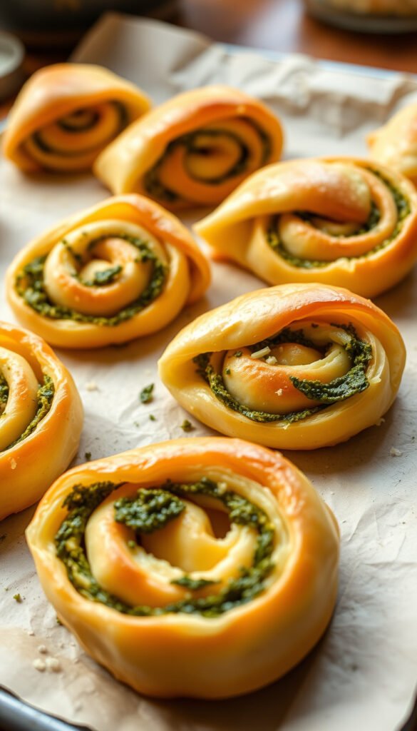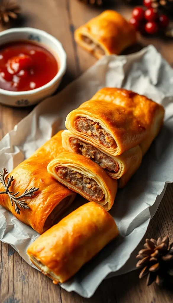 Wrap sausage in pastry, slice, brush with egg, bake until golden.