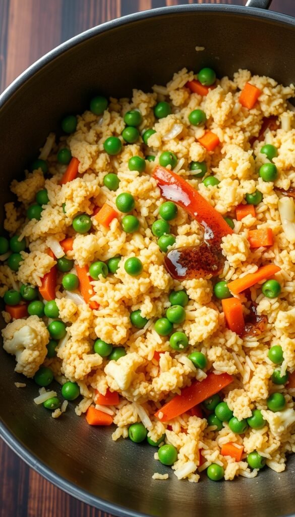 - Add cauliflower, peas, and carrots. Stir-fry for 5-7 minutes.