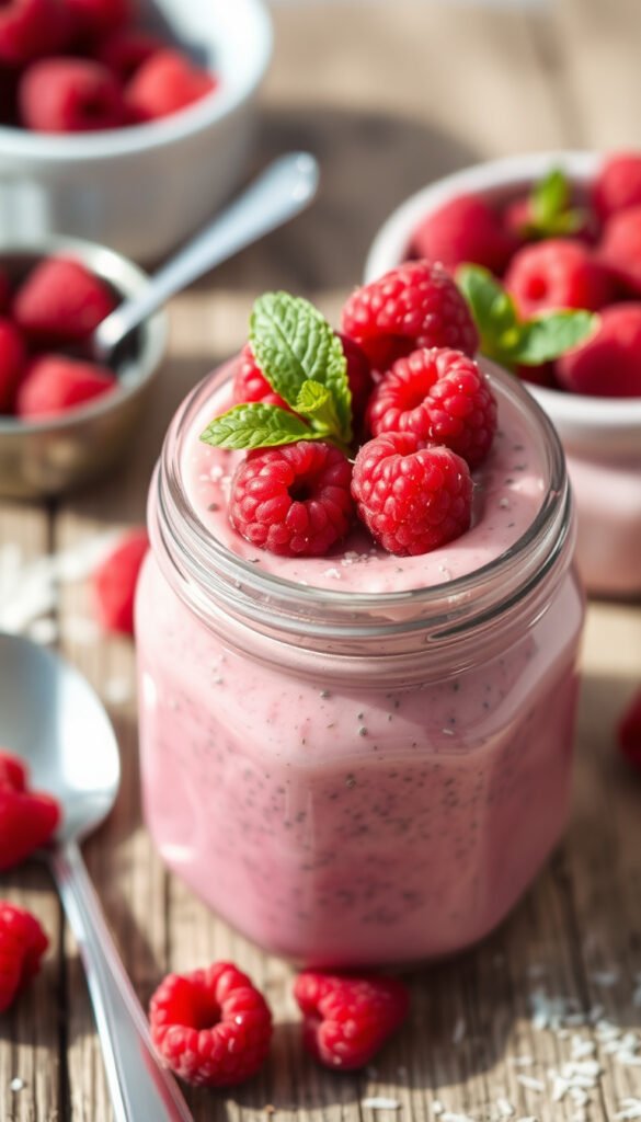 Before serving, give the pudding a good stir to break up any clumps. If it’s too thick, add a splash of almond milk to loosen it up. Serve topped with fresh raspberries, a sprinkle of nuts, seeds, or shredded coconut, and garnish with mint leaves for extra freshness.